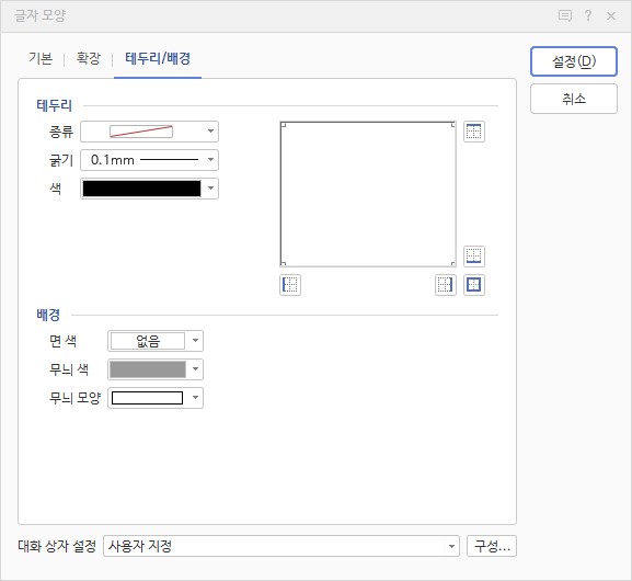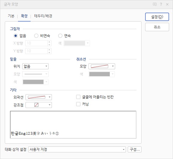 글자 모양에서 장평, 자간 뿐만 아니라 그림자, 밑줄 등 다양한 글자 모양을 적용할 수 있으니 이것 저것 적용해보세요.