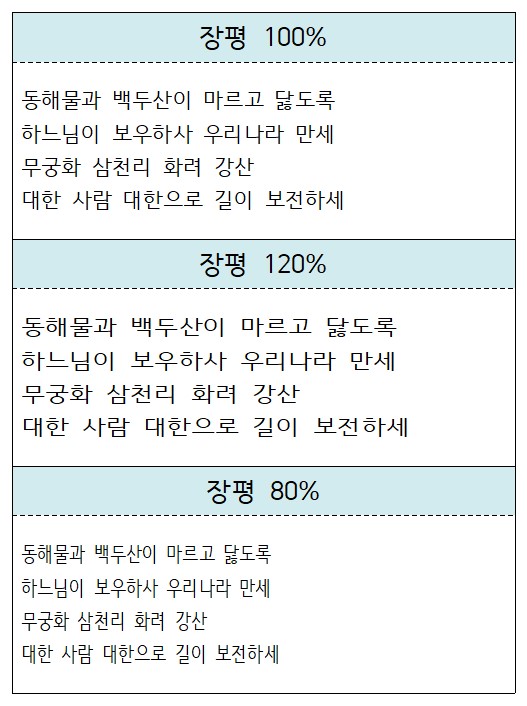 장평은 글자의 가로세로 비율을 뜻하며 기본값은 100%입니다. 50~200% 사이값으로 조절할 수 있습니다.