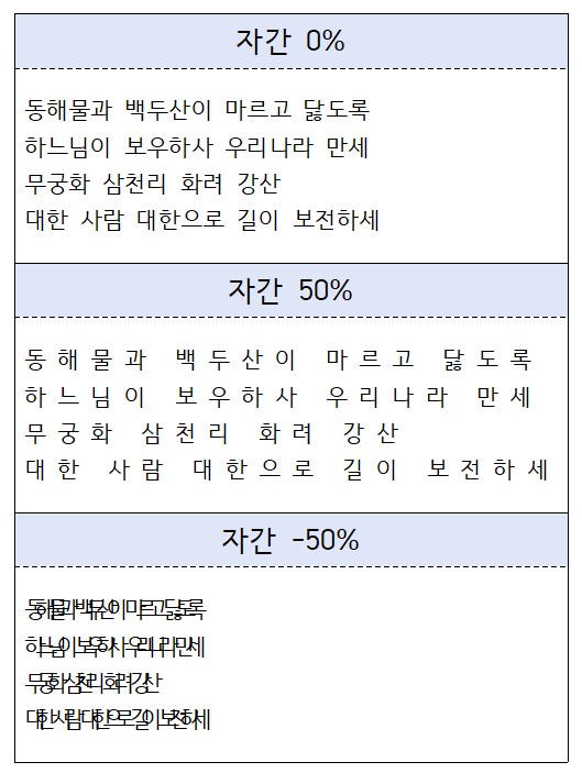 글자와 글자 사이를 자간이라고 하며 기본값은 0%입니다. -50%~50% 사이값으로 조절할 수 있습니다.
