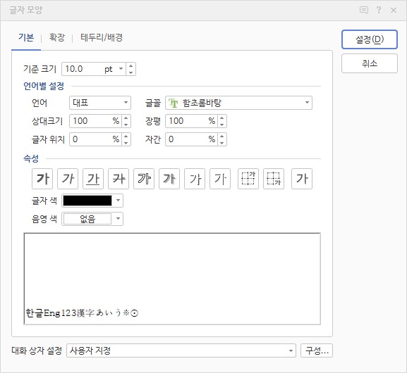 자간과 장평은 글자 모양에 들어가서 조절할 수도 있습니다. 글자 모양 단축키는 Alt + L 입니다.