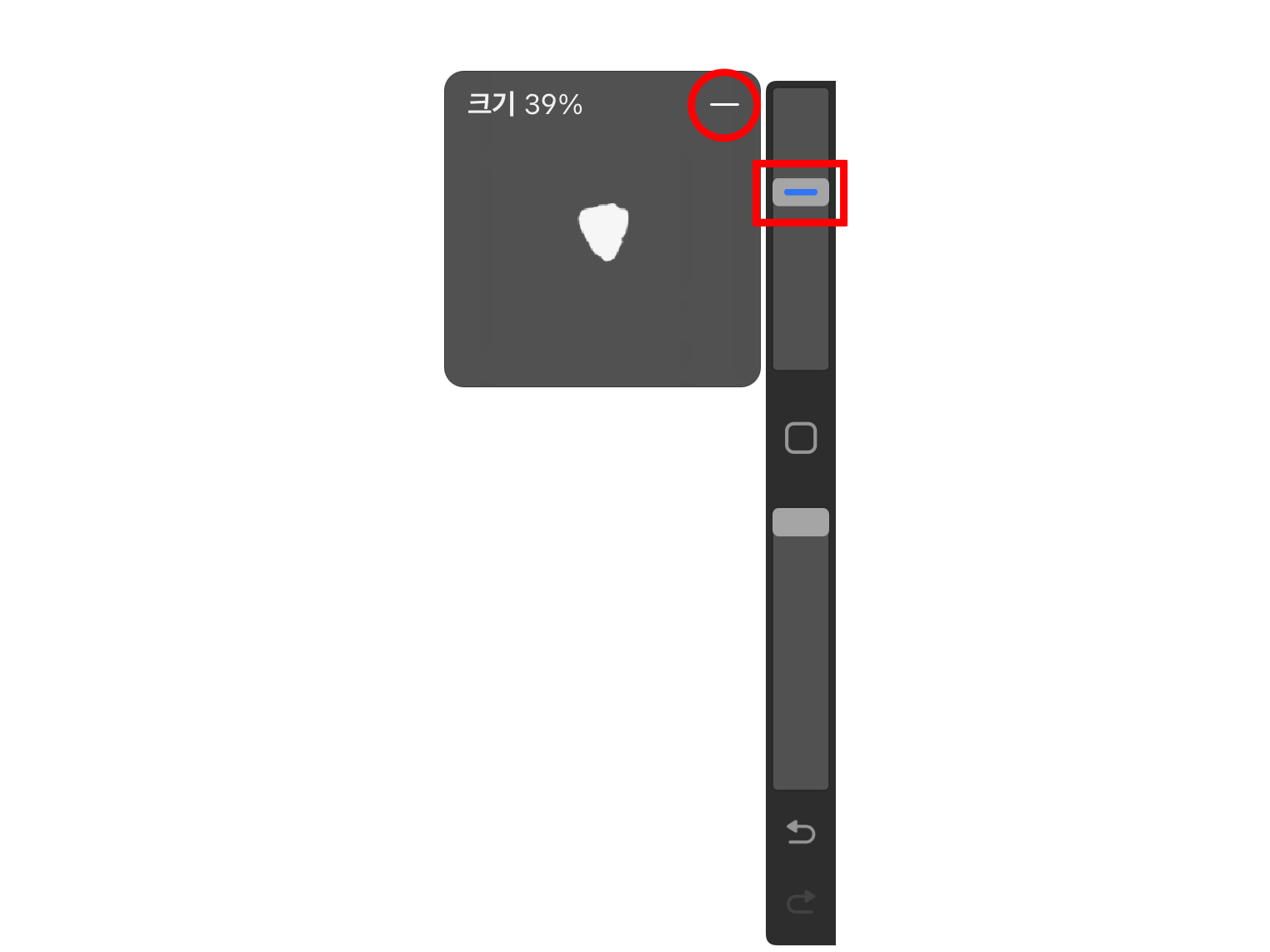 브러쉬 크기 조절바를 터치한 상태에서 왼쪽으로 이동합니다.