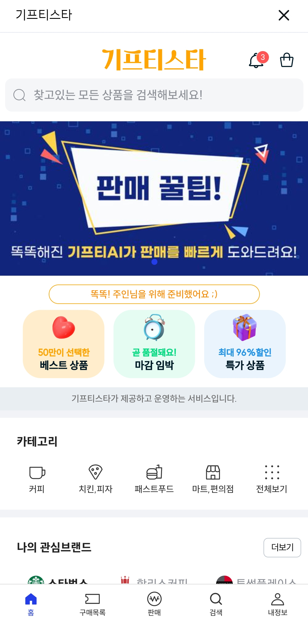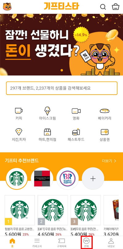 1. 기프티스타 메인화면 하단에있는 '판매'를 눌러줍니다.