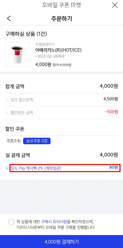 제가 기프티스타 어플을 사용하지 않고 신한 쏠을 사용하는 이유는 어플을 추가로 설치하지 않아도 된다는 장점도 있지만 저렴한 가격에 기프트콘을 구입하면서 SOL Pay를 2%나 캐시백까지 해주기 때문입니다. 이렇게 추가 할인까지 되니 꼭 챙겨서 사용하게 되더라구요.