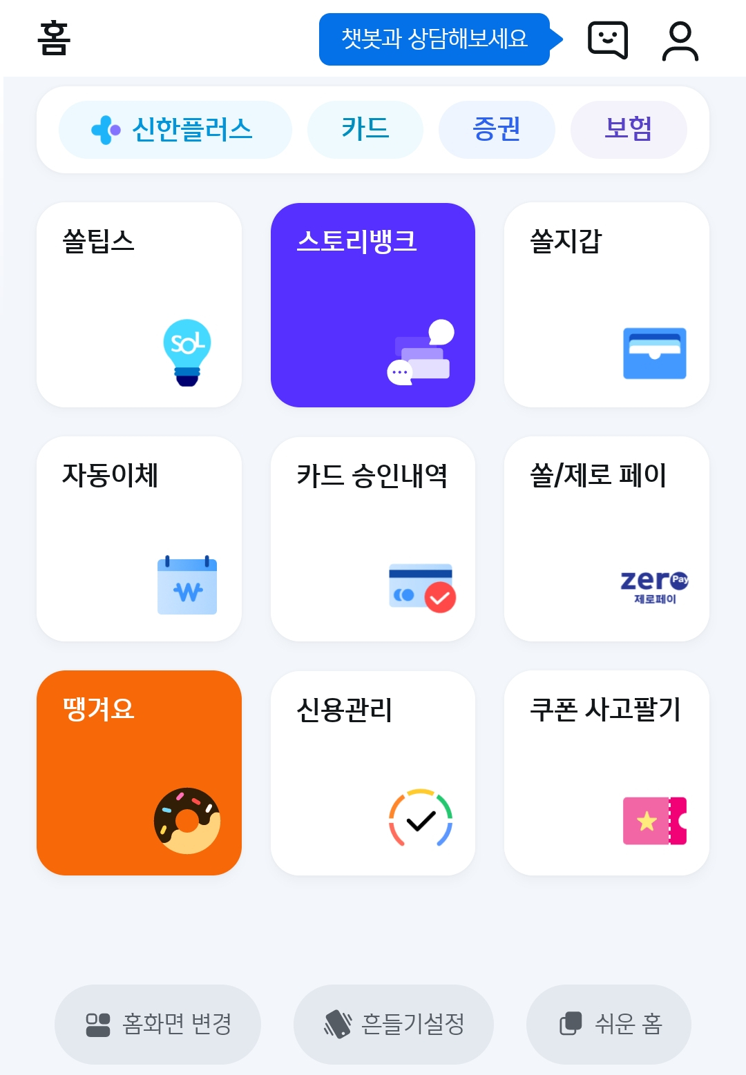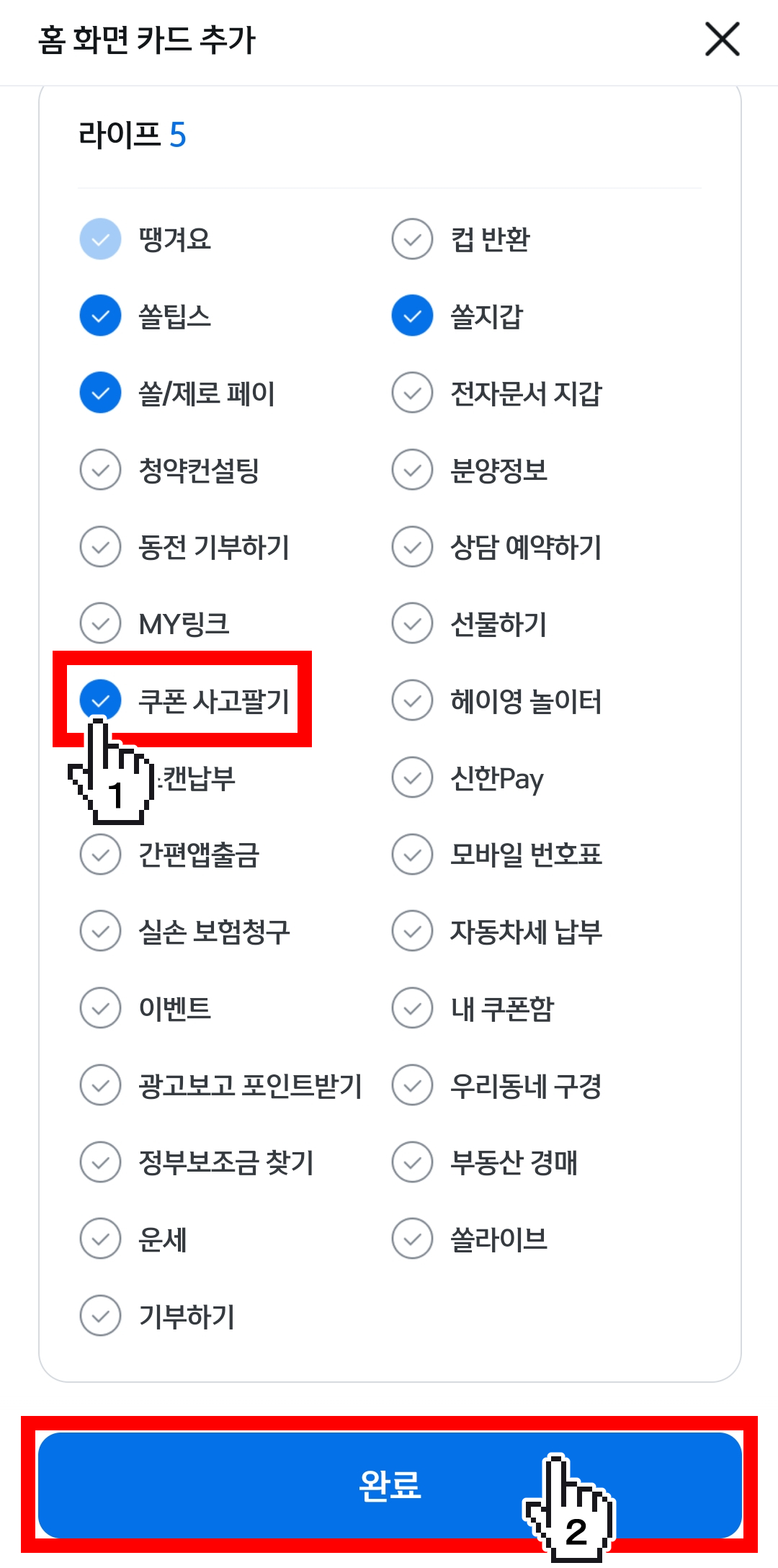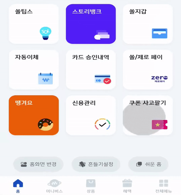 쿠폰 사고팔기 선택 > 완료를 선택하면 홈화면에 쿠폰 사고팔기 카드가 추가됩니다.