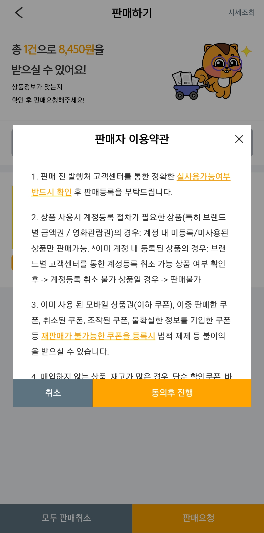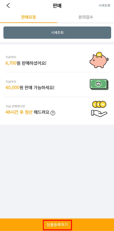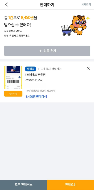 입력정보를 확인 한 뒤 판매요청을 선택하고