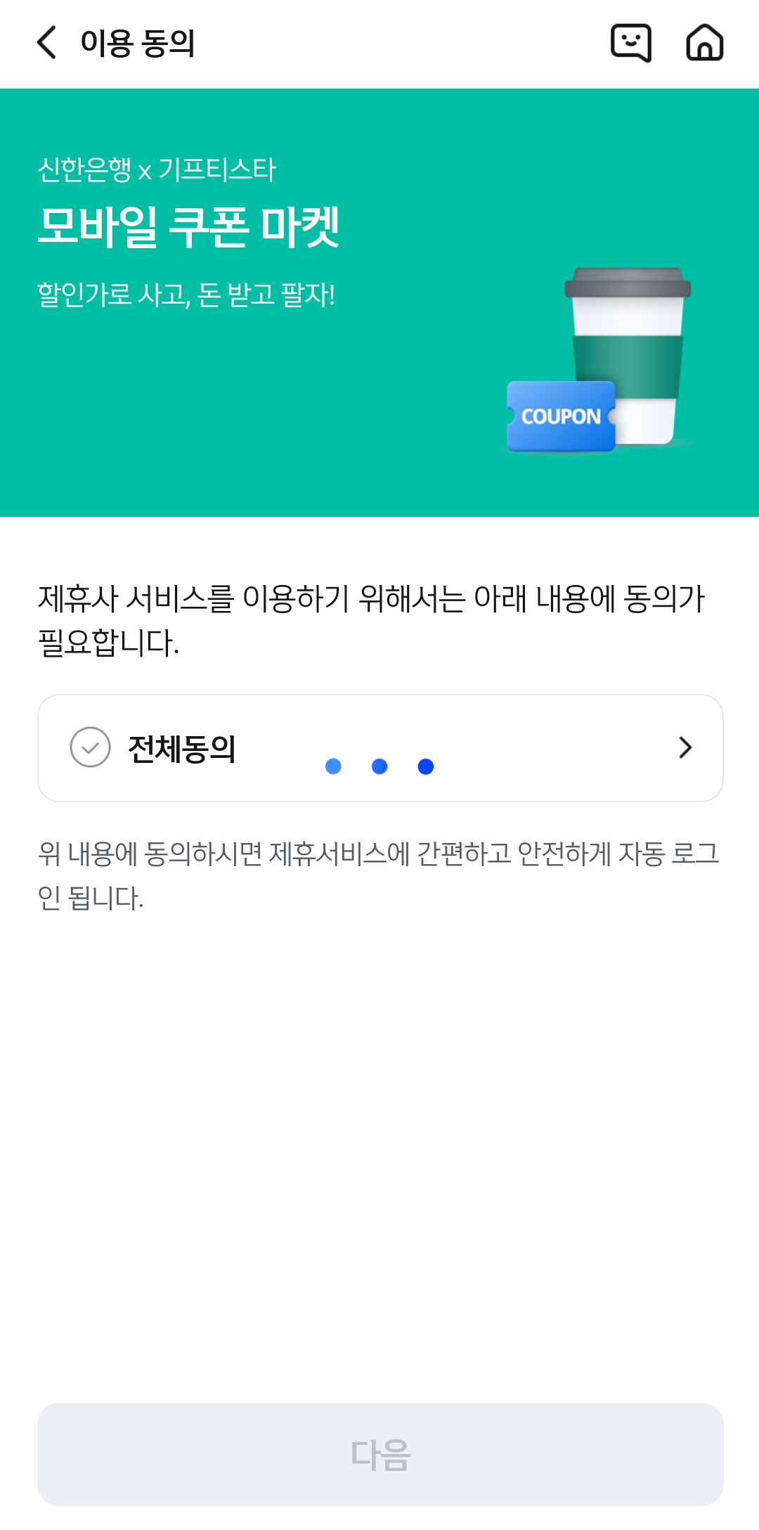 쿠폰 사고팔기를 선택하면 간단한 동의절차를 거친 후 기프티스타로 이동되여 동일한 서비스를 사용할 수 있습니다.