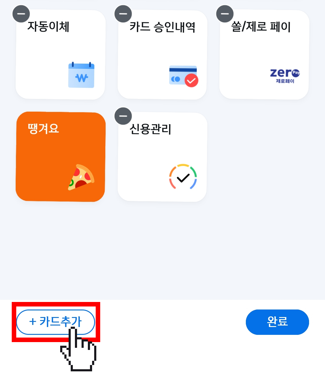이동 방법은 간단합니다. 이동하고 싶은 카드를 손가락으로 누르고 있으면 카드를 이동할 수 있습니다. 원하는 위치로 이동 후 완료를 선택해주세요.