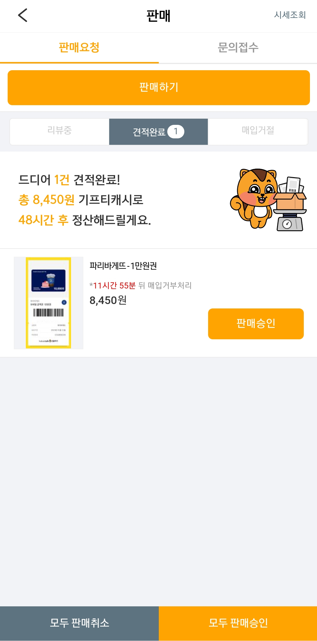 5. 기프티스타에서 기프트콘을 확인 한 후 리뷰가 끝나면 푸시알림으로 알려줍니다. 푸시알림이 오면 '판매승인'을 눌러주면 판매가 완료됩니다. 정말 간단하죠?