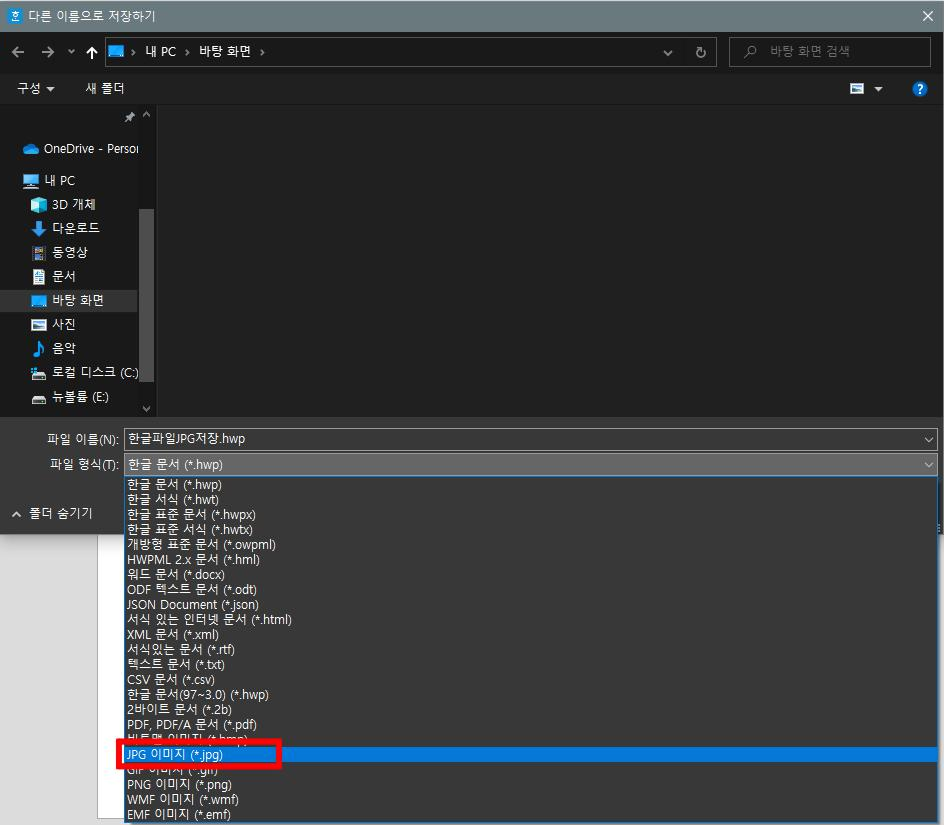 2. 파일 형식을 JPG로 선택한 다음 저장합니다. gif, png등 다른 확장자를 선택해서 저장해도 됩니다.