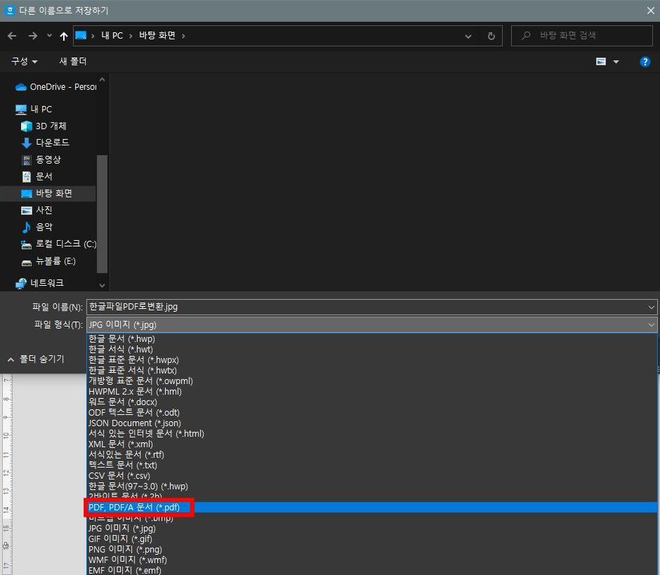 2. 파일형식을 PDF로 선택한 다음 저장을 눌러주면 PDF파일로 저장이 됩니다.