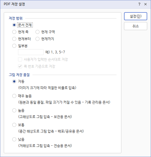 ◆ PDF파일 저장 품질 변경하고 싶다면 도구 > 저장 설정에서 변경해주세요.