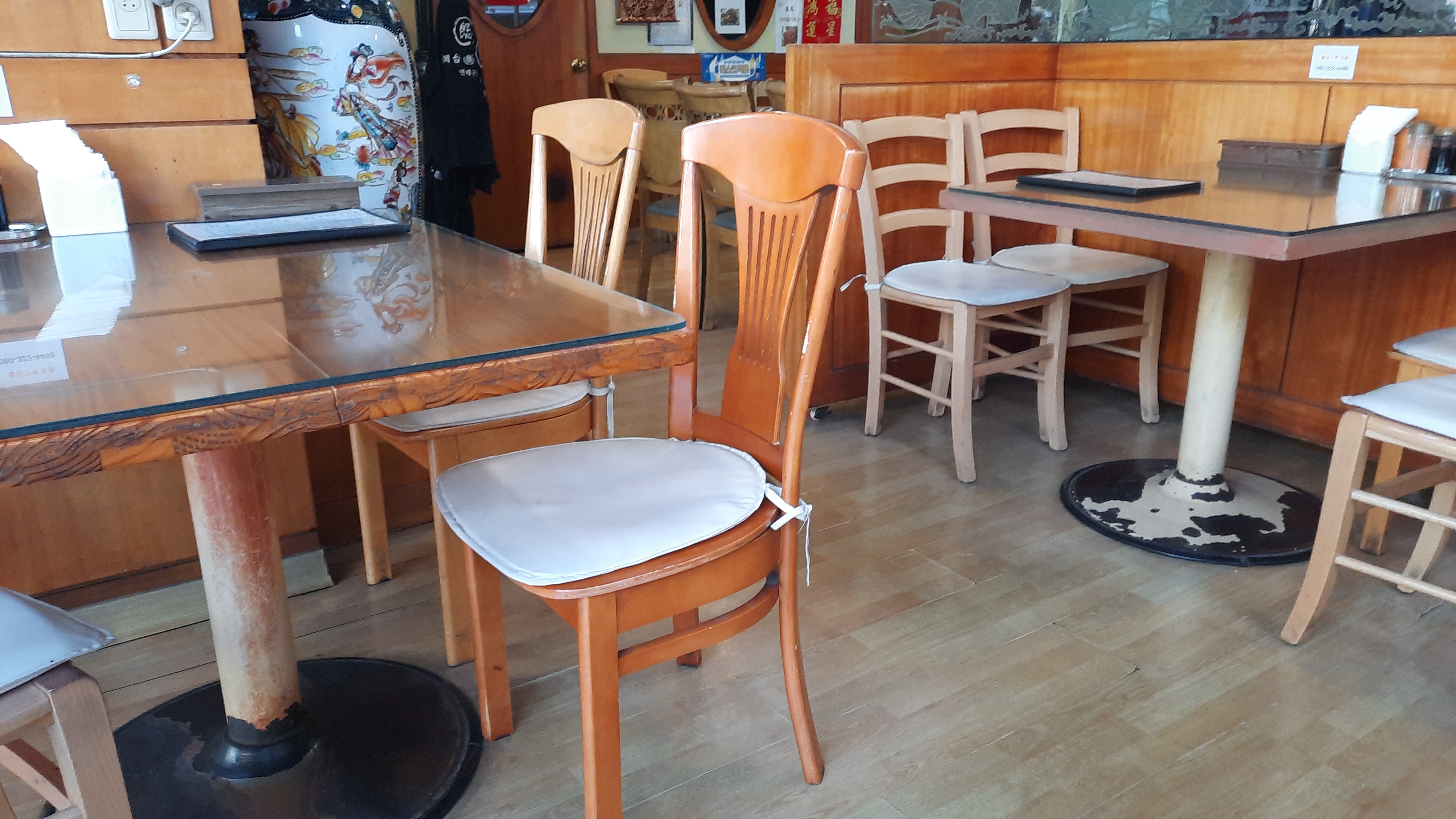 세월이 느껴지는 식탁과 의자이지만 천장이 높고 테이블 간 거리가 있어서 쾌적합니다.