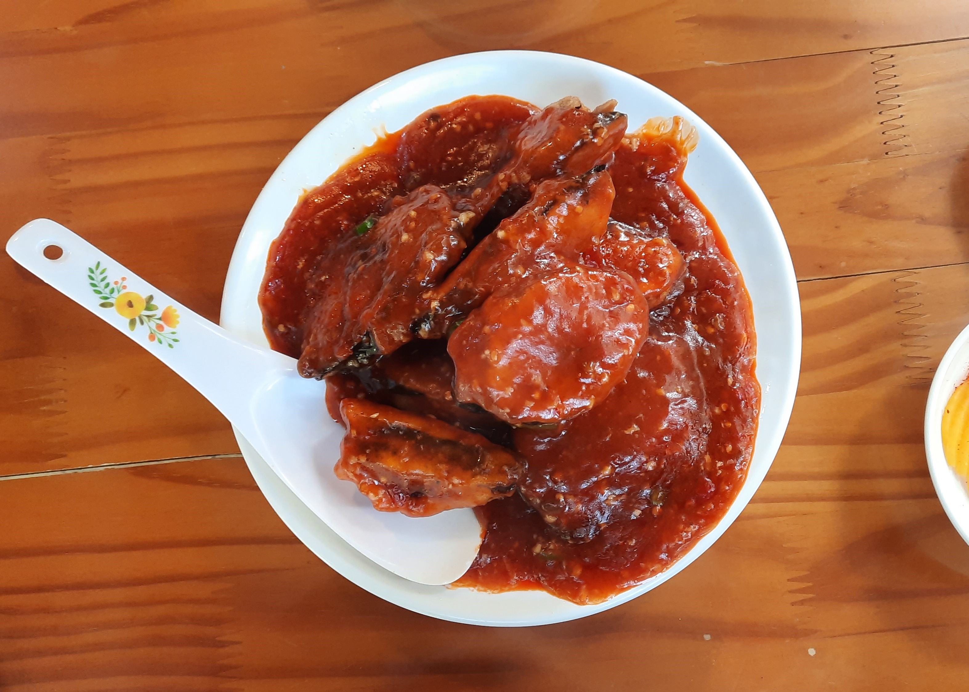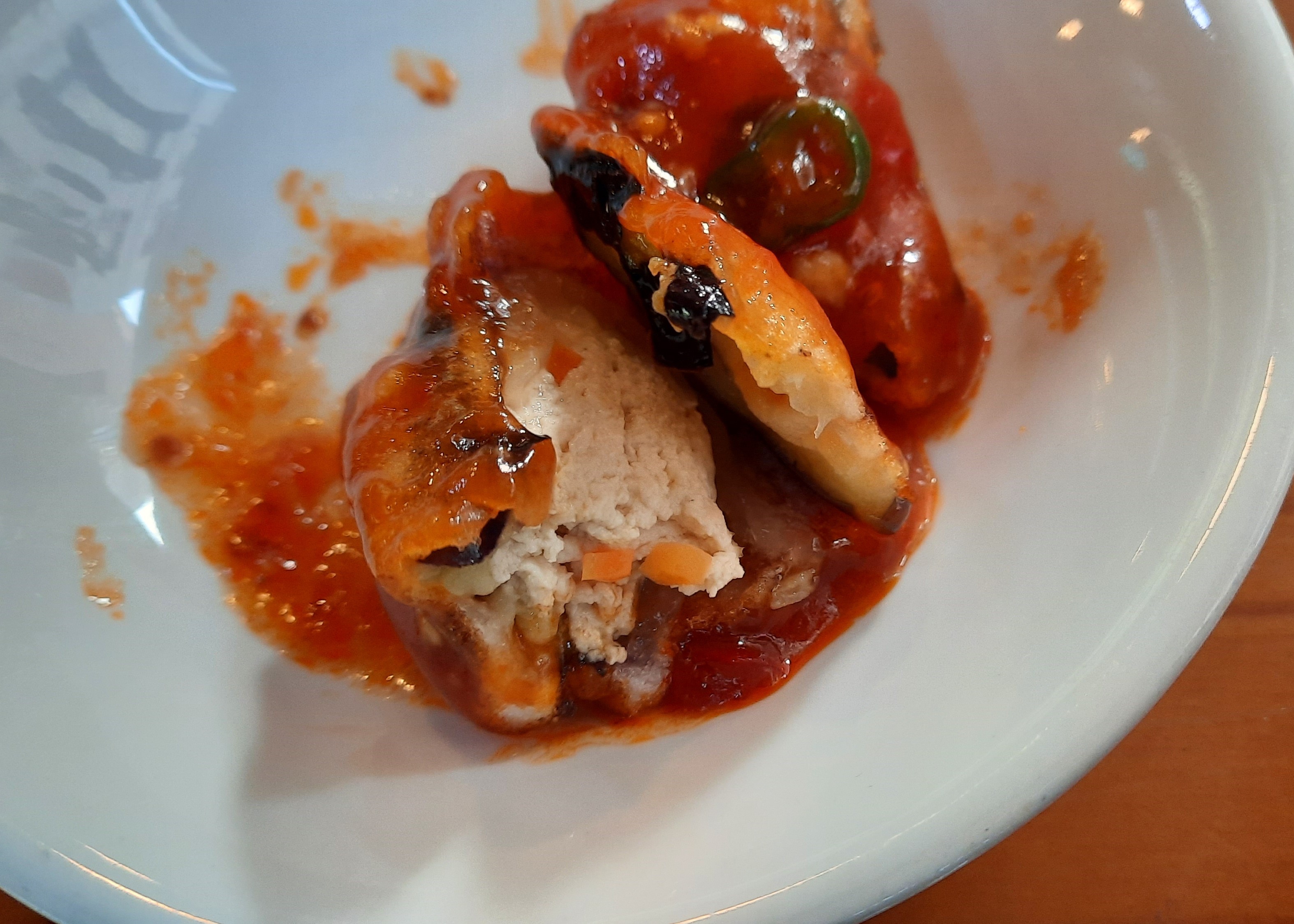 가지 사이에 으깬두부로 속을 채운 뒤 튀겨 냈습니다. 이름에 칠리가 들어가지만 제 입에는 맵지 않습니다. 가지튀김 자체는 싱겁지만 소스와 어우러지면서 간이 딱 맞습니다. 뜨거울 때가 최상으로 맛있어서 2개는 연달아 먹습니다.