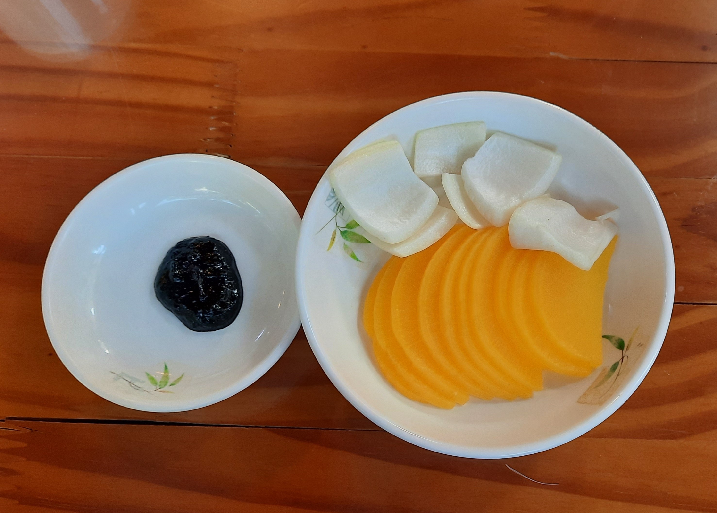 기본반찬입니다. 단무지는 아삭하니 맛있습니다. 양파는 매운 맛이 남아있어 매운 걸 못드시는 분은 주의!