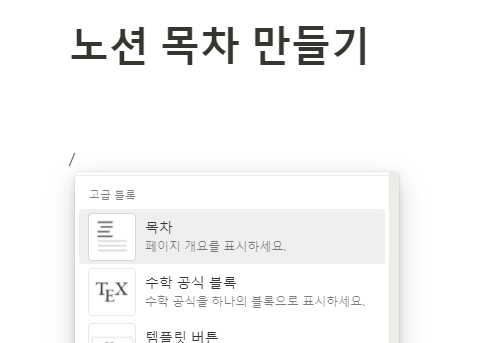 /목차 로 검색해도 되고 / 후 나오는 카테고리 중 고급 블록-목차를 선택해도 됩니다. 하지만 한참 스크롤바를 내리는 것 보다는 /목차로 검색하는게 낫겠죠?