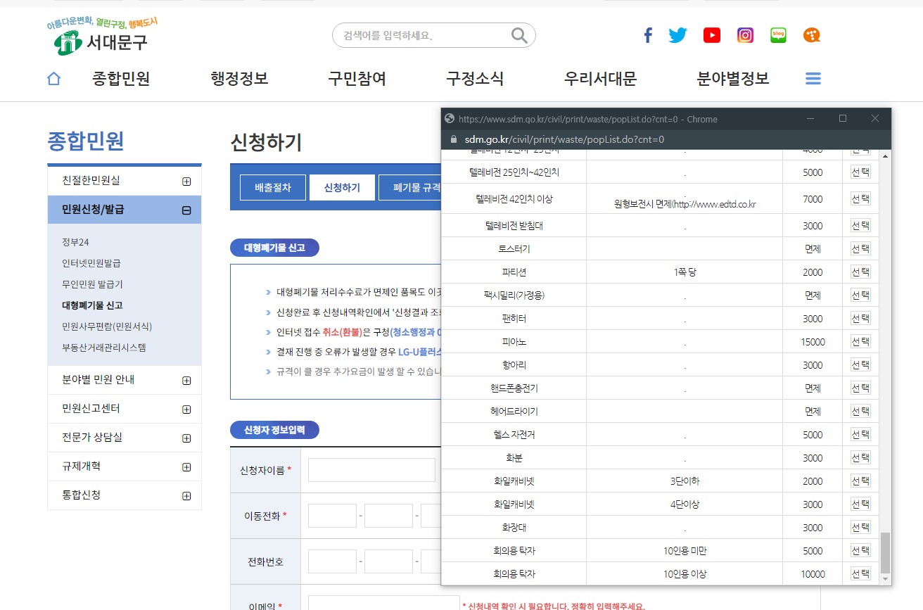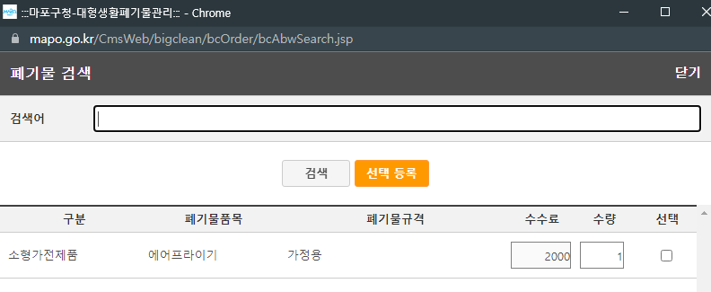그래서 서대문구청 홈페이지 > 대형폐기물 신고 페이지에 에어프라이어가 있는지 확인해봤습니다.