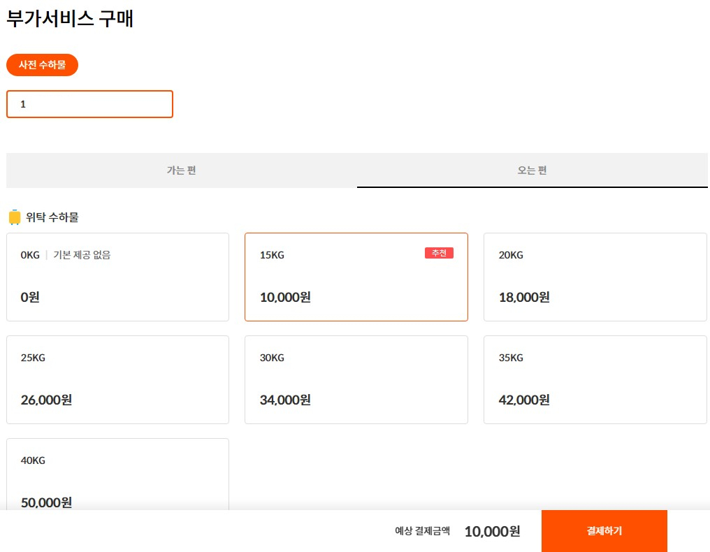 - 사전 수하물을 신청하는 가는 편/오는 편을 선택 후 위탁 수하물 kg를 선택합니다. 그리고 결제를 진행하여 사전 수하물을 구입하면 됩니다.
