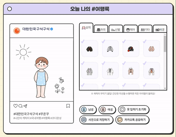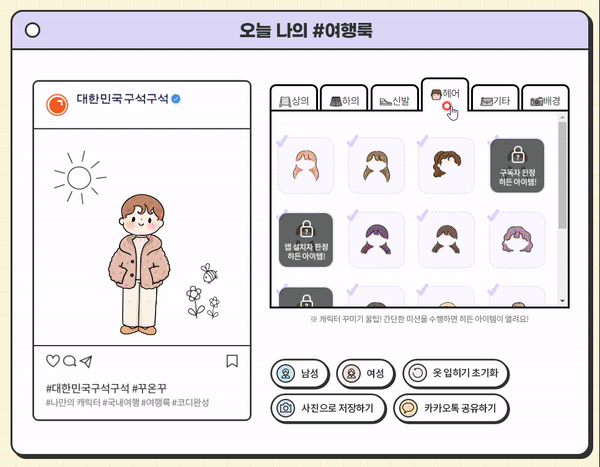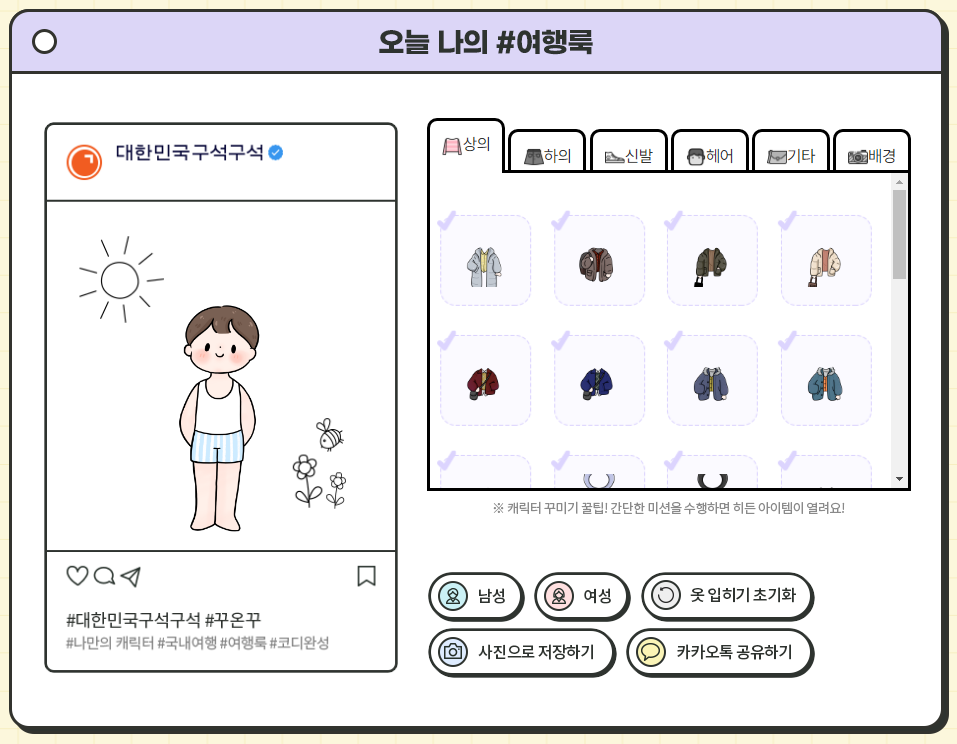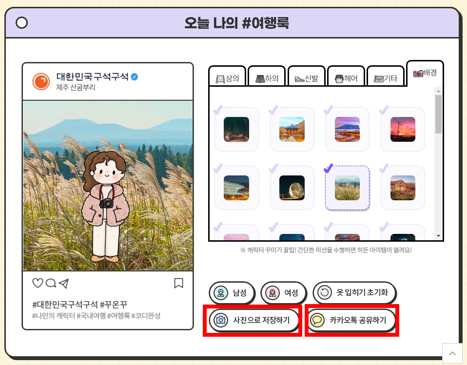 꾸민 여행룩은 사진으로 저장하거나 카카오톡으로 공유할 수도 있습니다.