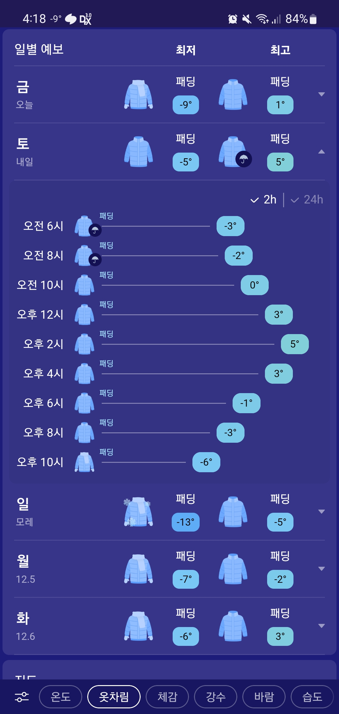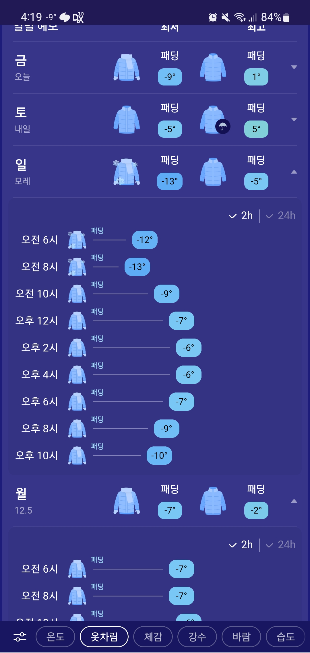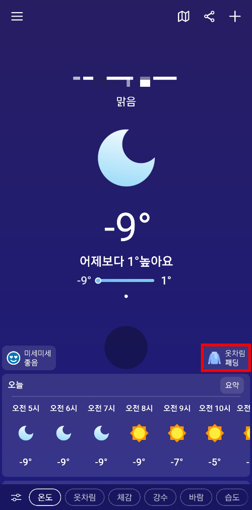 하단에 옷차림 메뉴를 선택하면 시간별 기온에 따른 옷차림이 나와서 옷을 어느 정도로 챙겨입어야하는지 오후에 외투를 챙겨야하는지 등을 판단할 수 있습니다.
