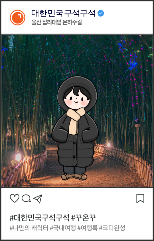 이건 오늘 저의 옷차림입니다. ㅋㅋㅋㅋ 너무 추워서 돌돌 싸매고 출근했네요. 배경은 울산 십리대밭 은하수길입니다. 언제 한번 놀러가고 싶네요.