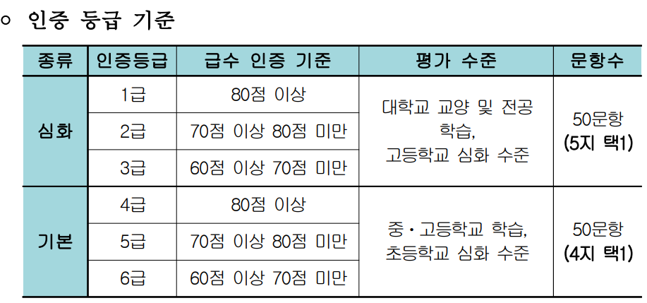 심화는 한국사에 대한 체계적인 이해를 바탕으로 한국사의 주요 사건과 개념을 종합적으로 이해하고, 역사 자료를 분석하고 해석하는 능력, 한국사의 흐름 속에서 시대적 상황 및 쟁점을 파악하는 능력을 보고 기본은 기초적인 역사 상식을 바탕으로 한국사의 필수 지식고 기본적인 흐름을 이해하는 능력을 평가한다고 합니다.