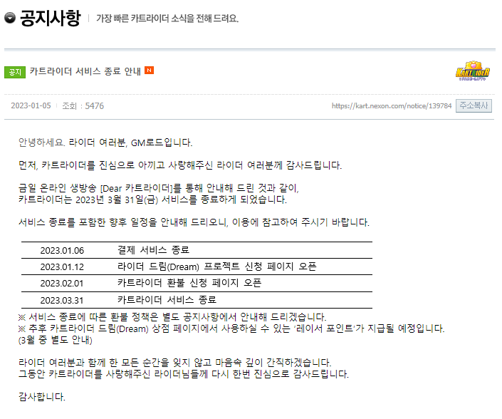 2022년 12월 9일 외부 기사를 통해 카트라이더의 서비스종료 기사가 외부 뉴스기사에서 들려왔습니다. 그리고 2022년 12월 11일에 2004년 6월 1일 출시하여 18년 동안 장수한 카트라이더가 2023년 3월 31일자로 서비스를 종료한다고 공식공지되었습니다.
