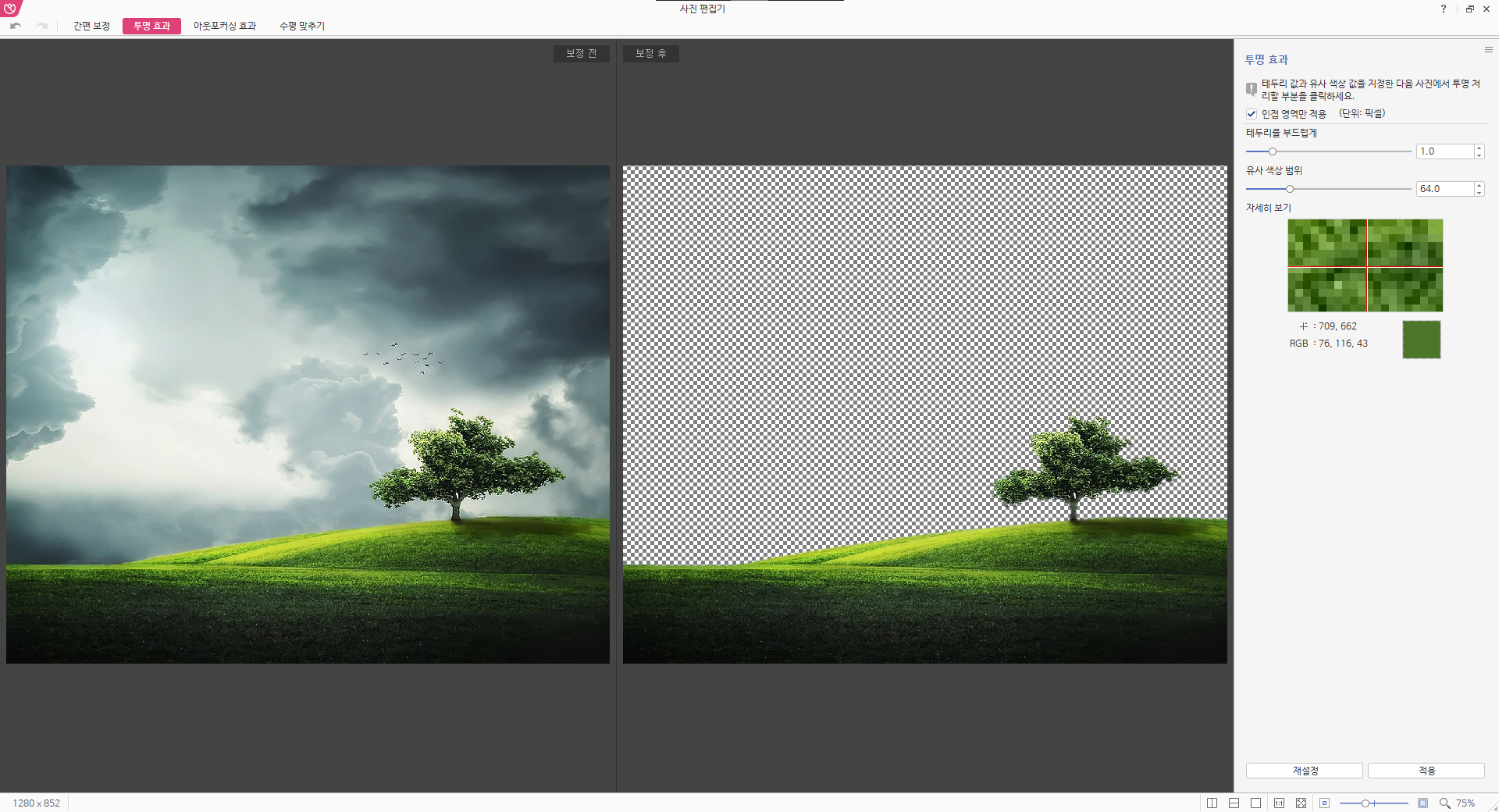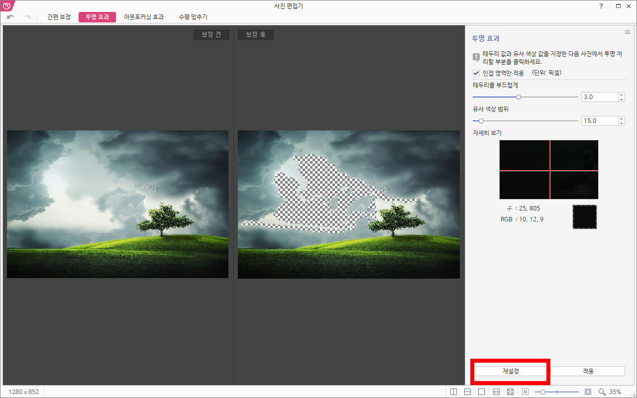 테두리를 부드럽게, 유사 색상 범위의 수치를 조절한 뒤