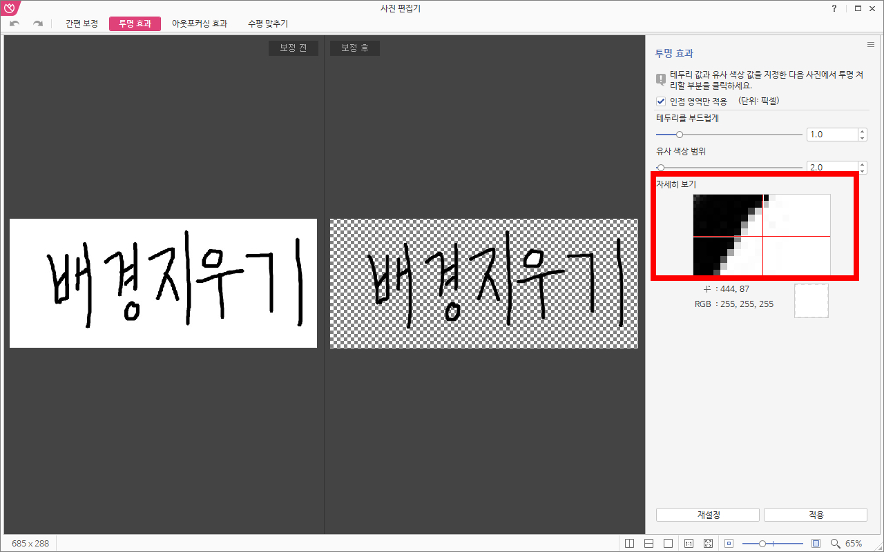 오른쪽에 위치한 자세히 보기에서 마우스 커서 위치를 알 수 있어 원하는 영역을 선택하기 수월합니다. Crtl을 누른 상태에서 휠마우스를 위아래로 굴려 이미지를 확대축소 할 수도 있습니다.