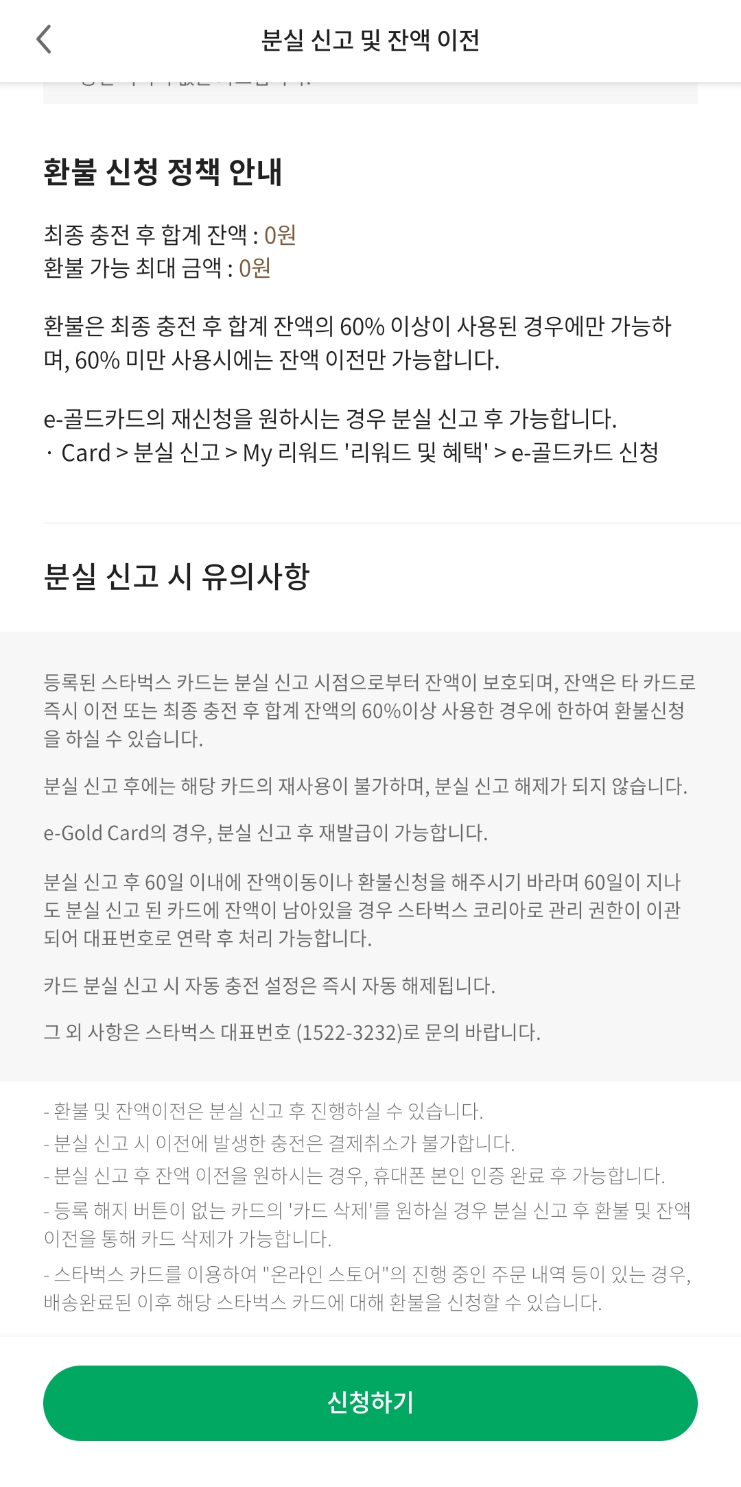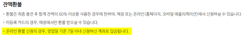 잔액환불은 최종 충전 후 합계 잔액의 60% 이상을 사용한 경우에만 가능합니다.