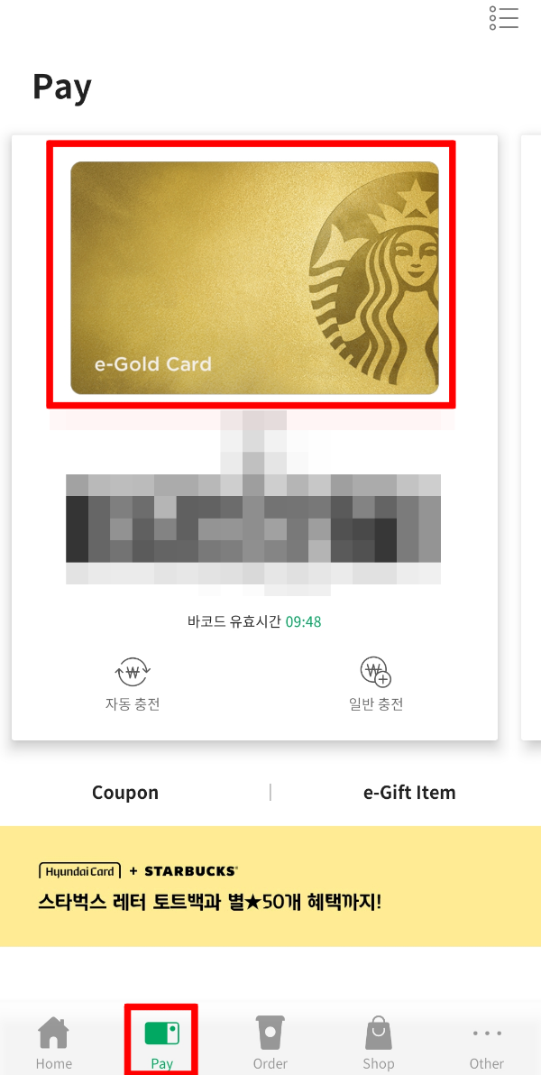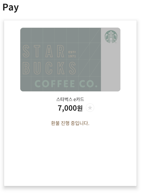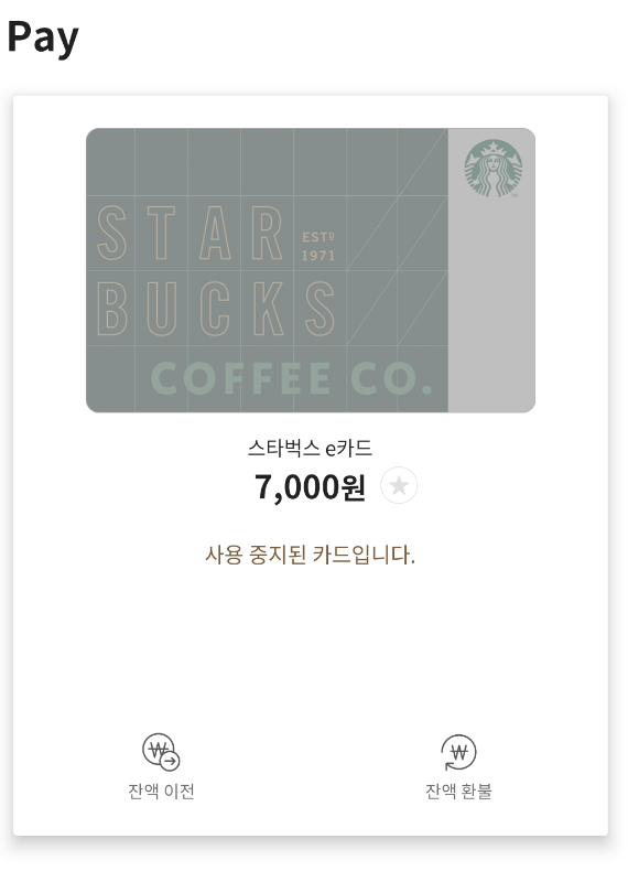 저는 앱을 통해 환불을 받았습니다. 스타벅스 앱 > Pay에서 환불받을 카드를 선택합니다.