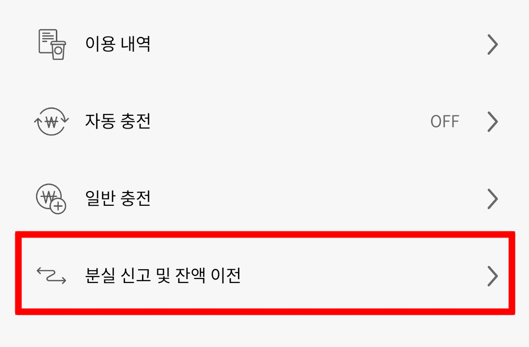 분실 신고 및 잔액 이전을 선택합니다.
