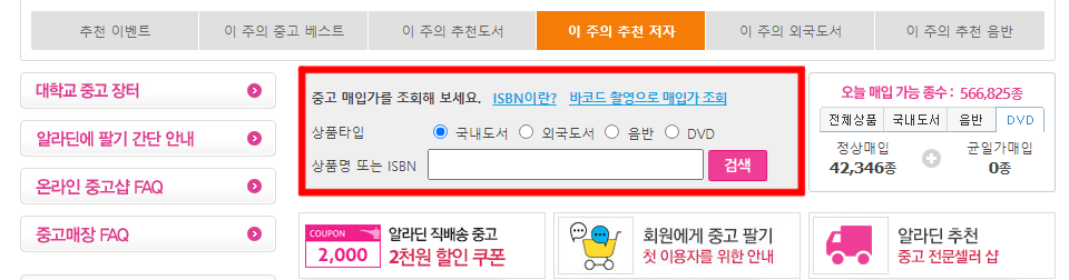 판매 가능한 책과 중고 매입가 조회하는 방법 - 홈페이지