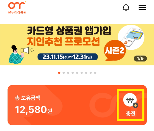 충전을 눌러 원하는 금액만큼 충전합니다.