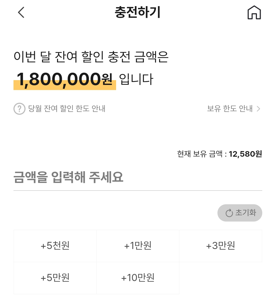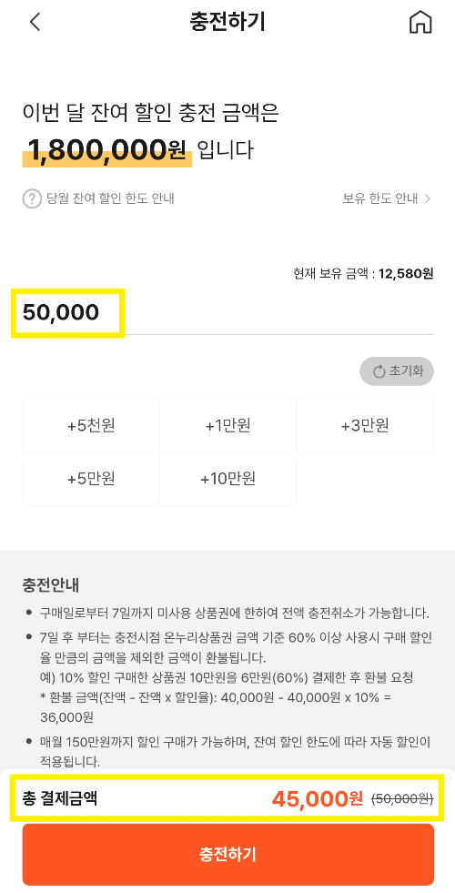 5만원을 충전하면 10% 할인이 되서 45,000원만 결제하면 됩니다. 너무 좋죠?😆
