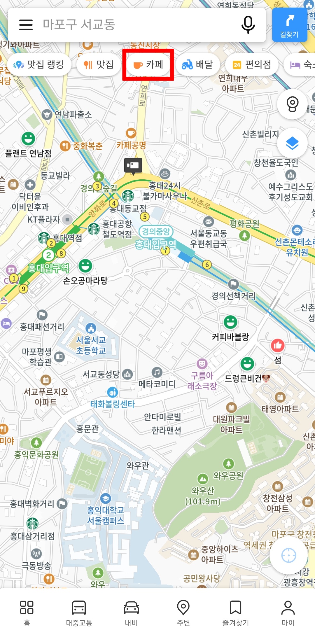 카카오지도 앱에서 반려동물 동반가능 카페를 찾고 싶다고 치면 앱 상단에 카페를 선택합니다.