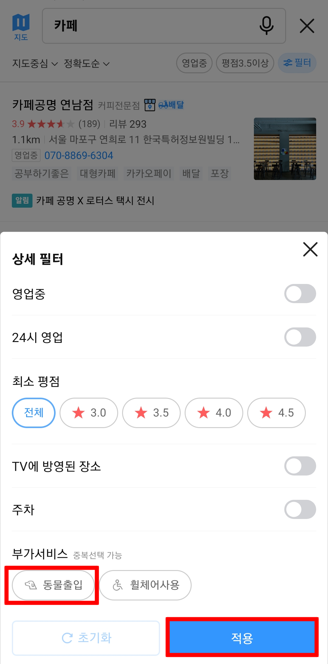 카카오지도 앱에서 반려동물 동반가능 장소 찾는 방법