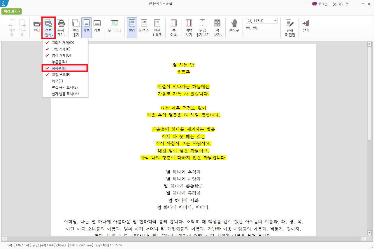 선택인쇄 > 형광펜을 선택해주시면 됩니다.