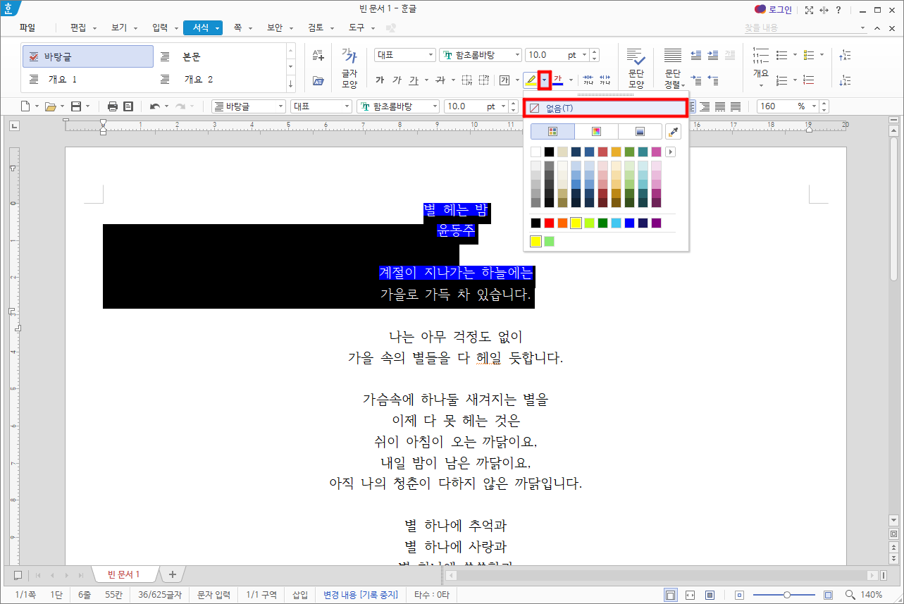 형광펜 ▾ > 없음을 선택하면 지워집니다.