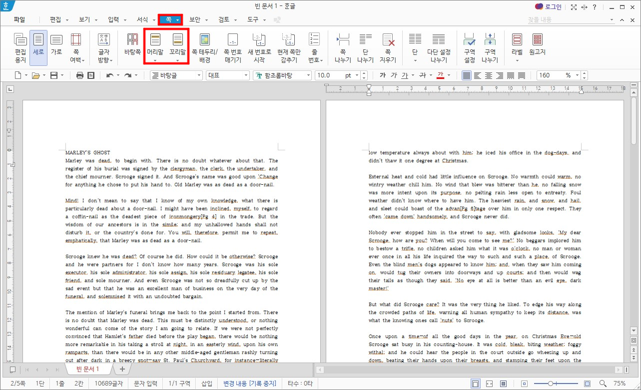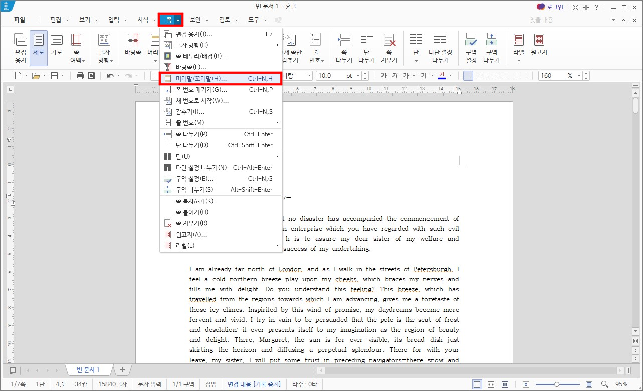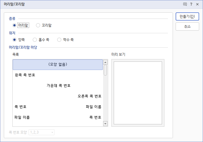 쪽 > 머리말/꼬리말을 클릭합니다.