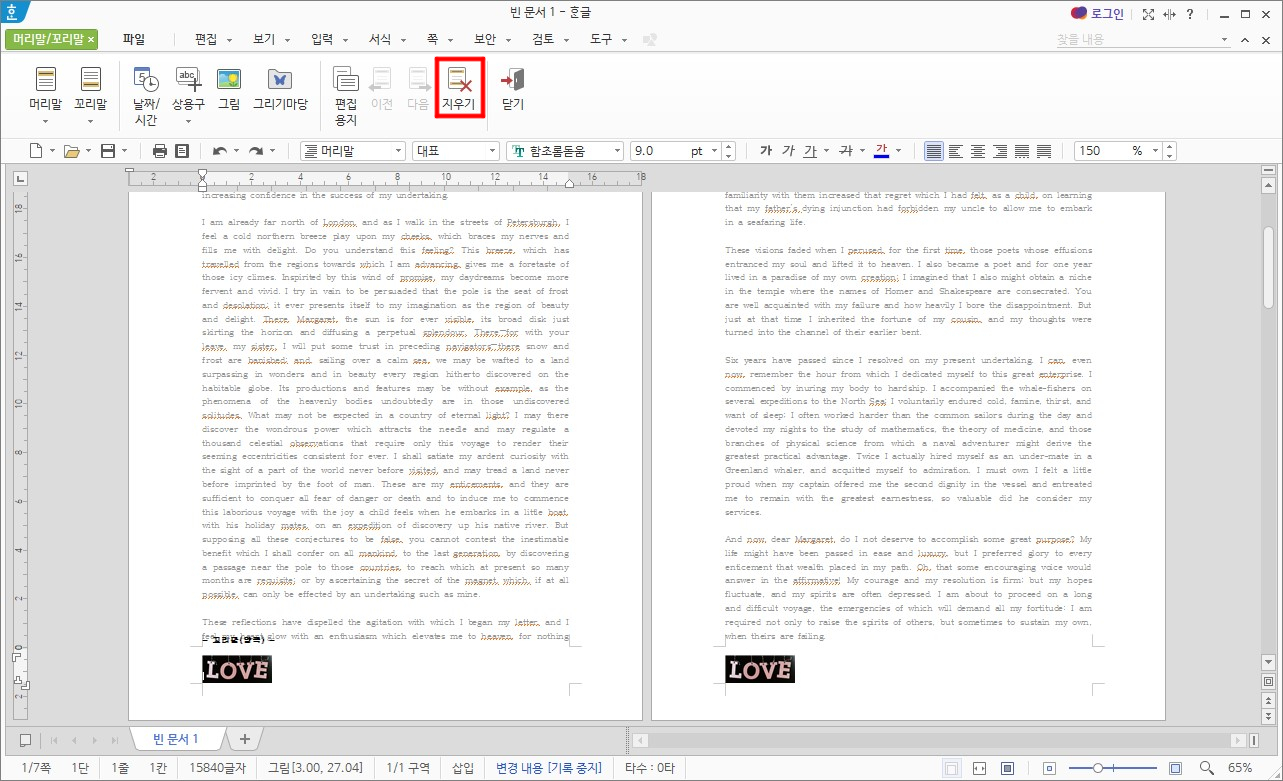 완전히 지우려면 지우고 싶은 머리말/꼬리말 영역을 마우스로 두 번 클릭합니다. 지우기 > 지움을 클릭하시면 됩니다.