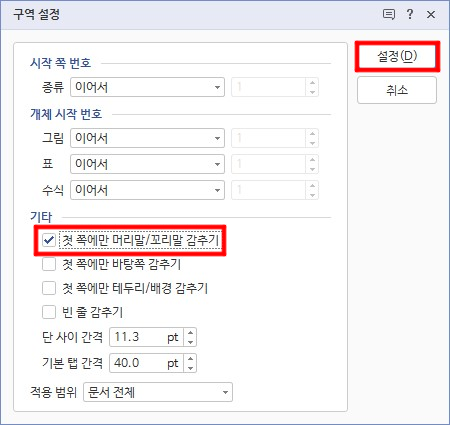 첫 쪽에만 머리말/꼬리말 감추기에 체크한 후 설정을 클릭하시면 됩니다.