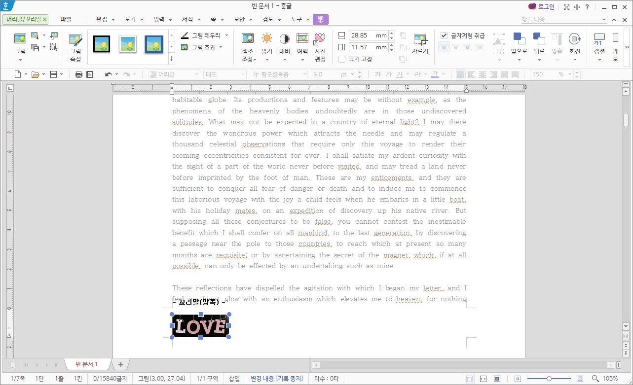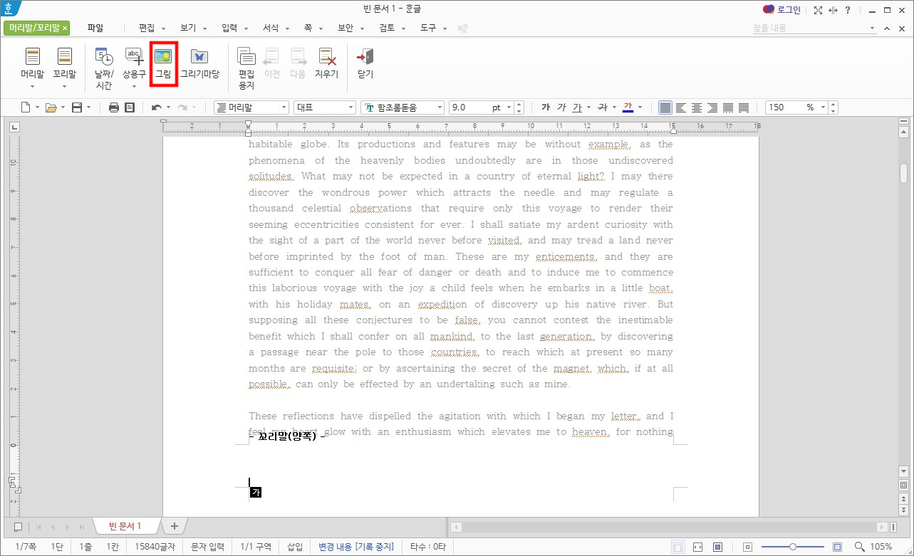 그림을 넣습니다. 이렇게 넣기만 하면 그림 위치를 정렬하기가 힘듭니다. 그림을 글자처럼 취급하면 정렬하기 편합니다.