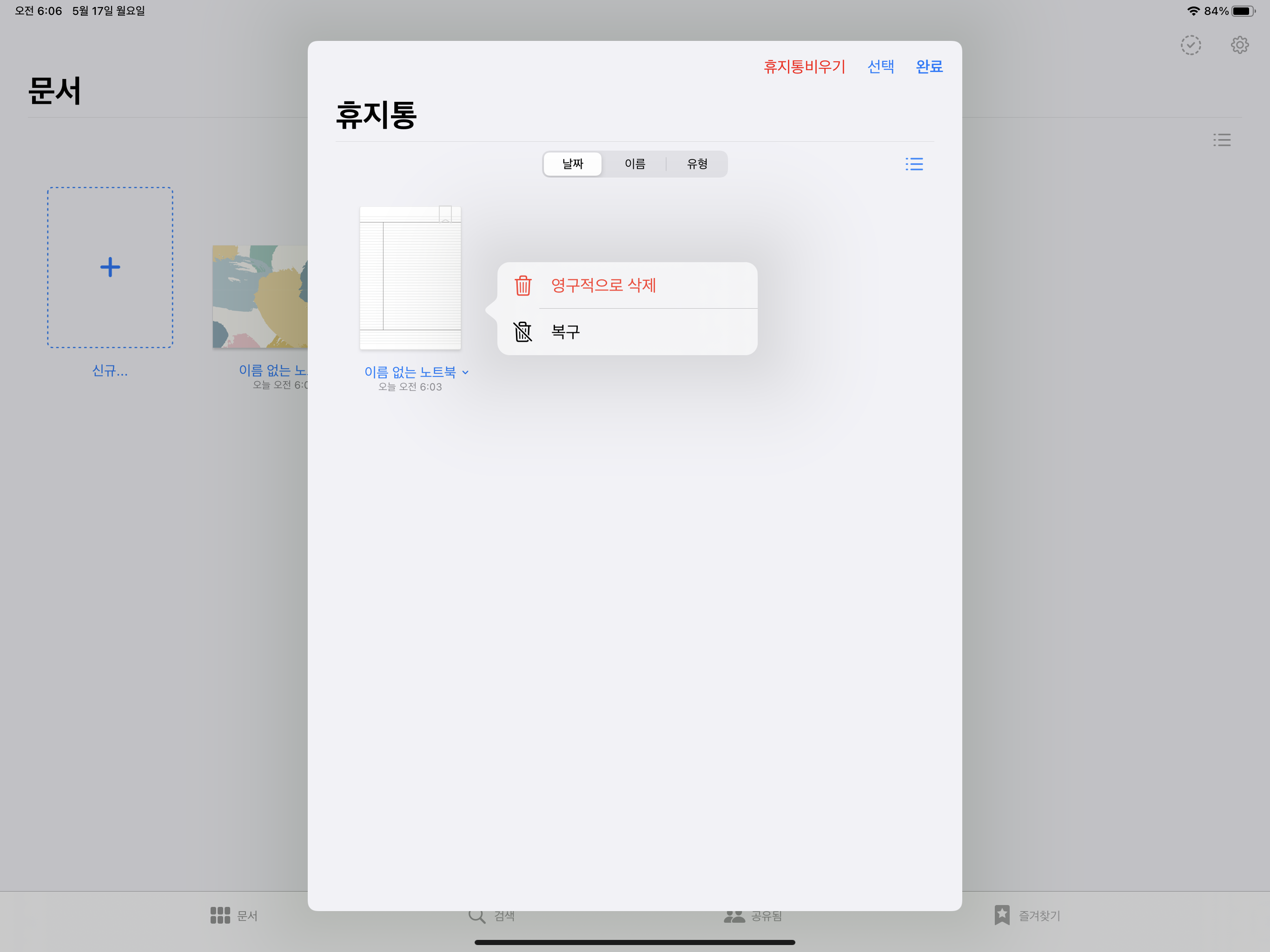 '복구'를 선택하면 페이지가 원래 노트로 복구가 됩니다.