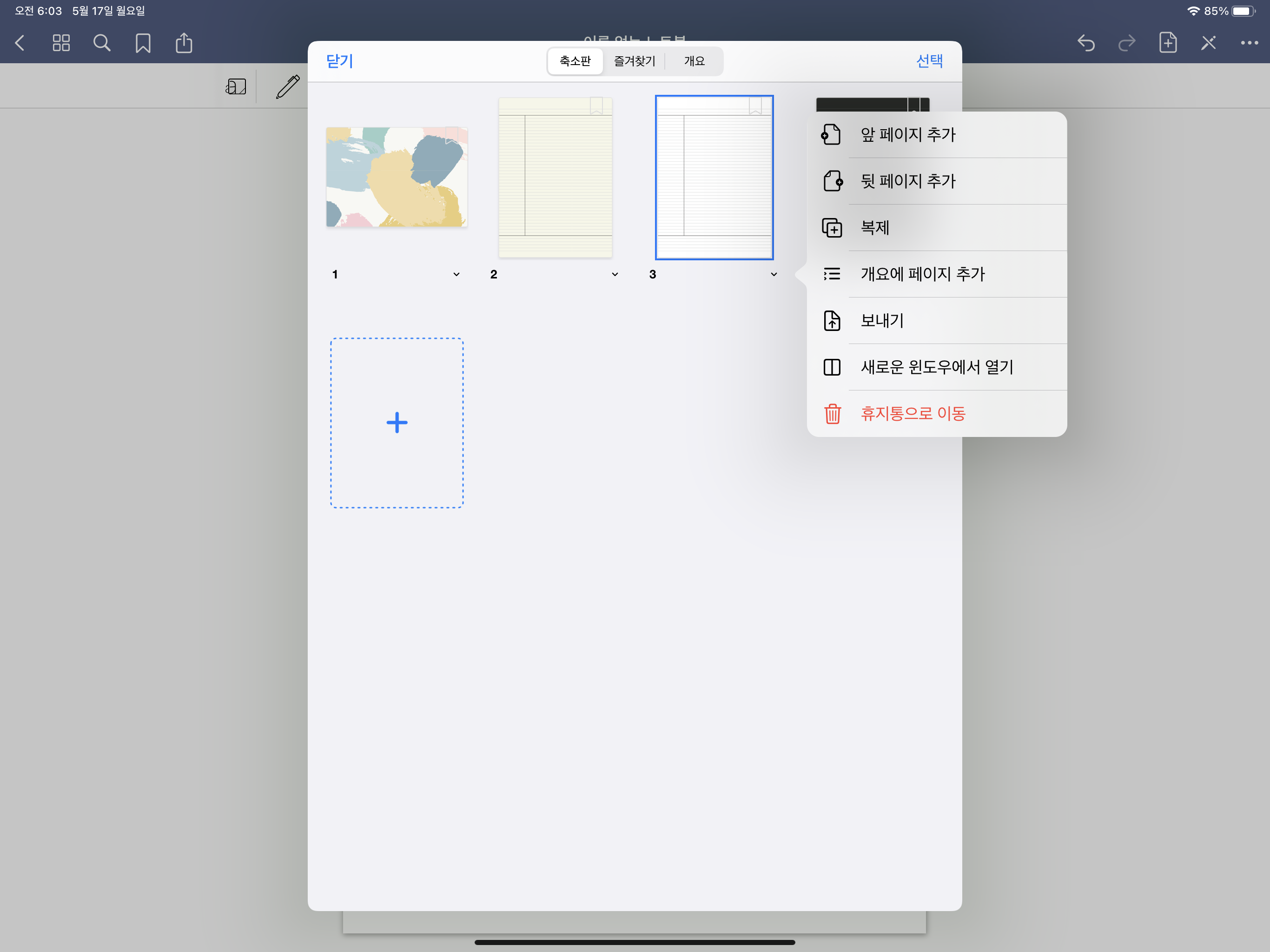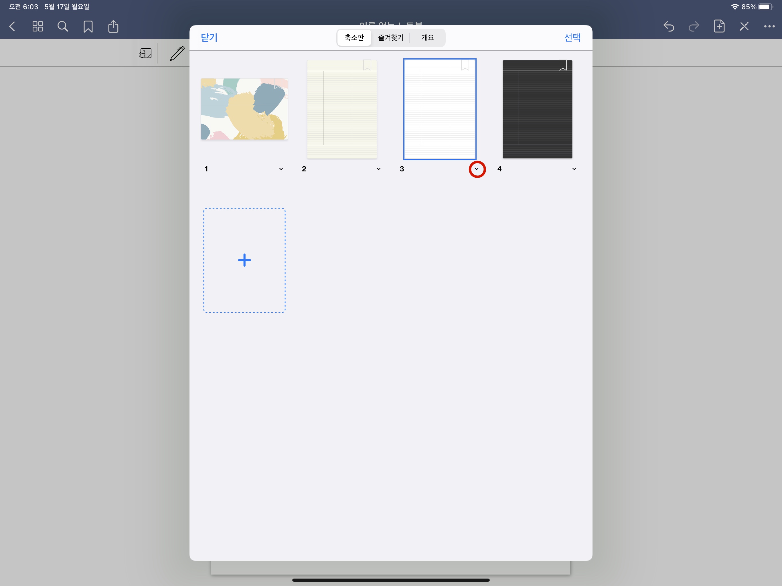 축소판에서 삭제하고 싶은 페이지 아래에 위치한 v를 선택합니다.